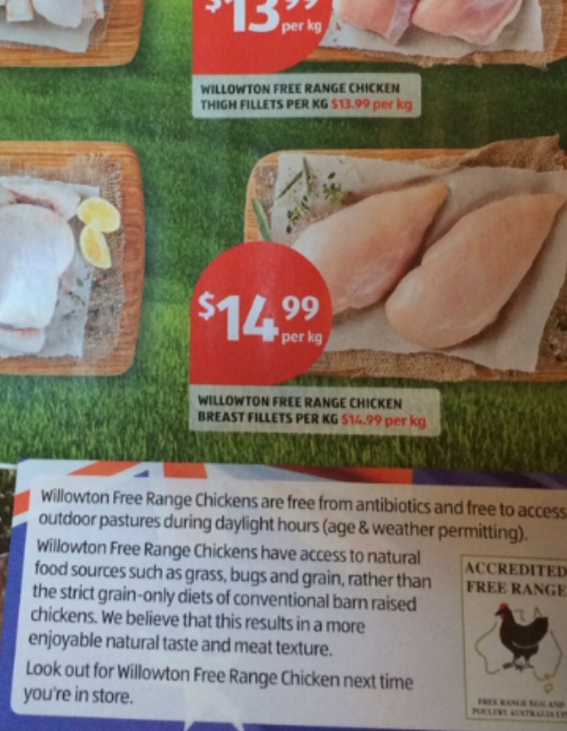 I only just picked up and read an Aldi catalogue and noticed they are starting to educate consumers what free range means with their Willowton chicken.