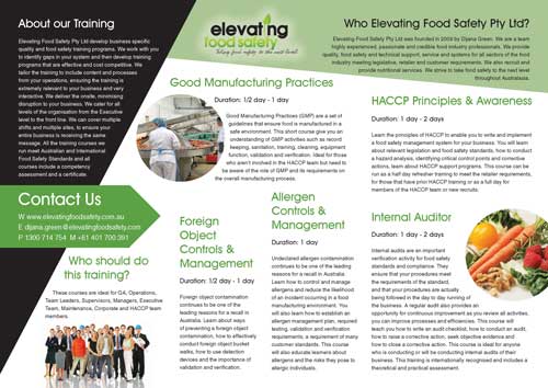 Elevating Food Safety Pty Ltd develop business specific quality and food safety training programs. We work with you to identify gaps in your system and then develop training programs that are effective and cost competitive. We tailor the training to include content and processes from your operations, ensuring the training is extremely relevant to your business and very interactive.